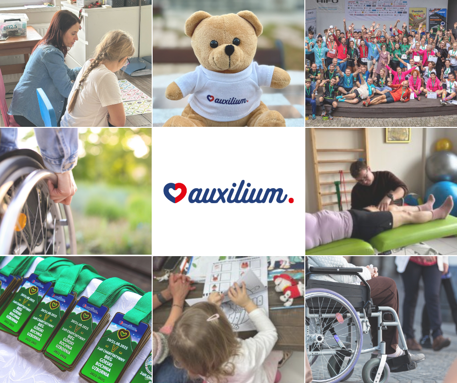 Dostępność: Plakat składa się z kilku zdjęć ułożonych w siatkę na jasnym tle. W środku jest logo „auxilium” w kolorze granatowym, obok czerwono-granatowe serce. Na zdjęciach są różne sceny pomocy: kobieta siedzi przy stole z dzieckiem i wspólnie pracują, terapeuta ćwiczy z osobą leżącą na zielonym łóżku, a obok grupa ludzi w kolorowych koszulkach cieszy się i podnosi ręce do góry. Jest też jasnobrązowy miś w białej koszulce z napisem „Auxilium”, zielone medale z biało-niebieskimi wstążkami oraz osoby poruszające się na wózkach inwalidzkich. Kolory są spokojne: dużo zieleni, bieli, granatu i czerwieni. Całość budzi poczucie wsparcia, radości i wspólnoty.