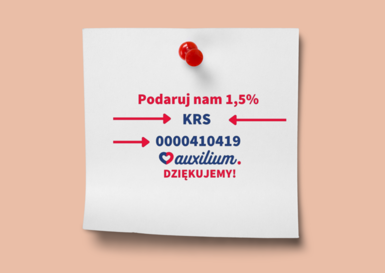 Dostępność: Na jasnym, beżowym tle znajduje się biała kartka przypięta czerwoną pinezką u góry. Kartka wygląda jak notatka na tablicy i ma spokojny, przyjazny klimat. Na środku kartki jest czerwony napis: „Podaruj nam 1,5%”. Poniżej znajduje się niebieski napis „KRS”, a pod nim numer „0000410419”, na który wskazują czerwone strzałki z obu stron. Niżej umieszczone jest logo Fundacji Auxilium w kolorach niebieskim i czerwonym oraz czerwony napis „Dziękujemy!”. Całość budzi poczucie prostoty, wdzięczności i zachęca do pomocy innym.