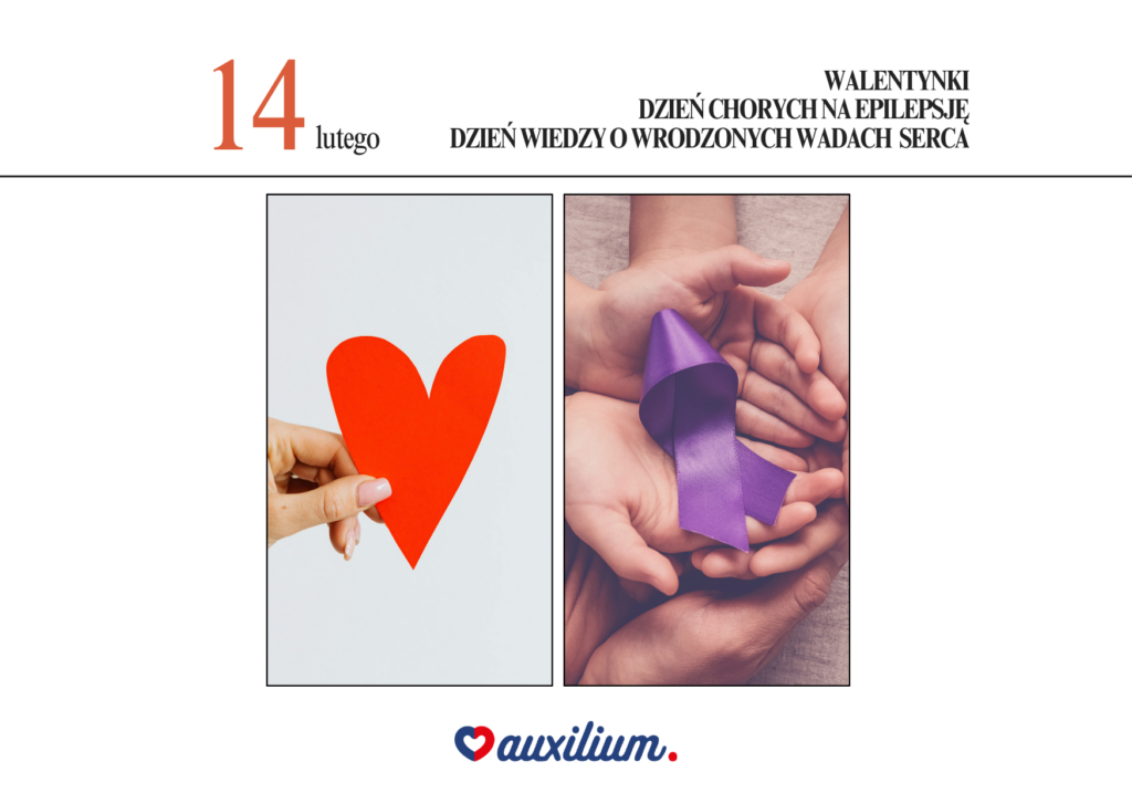 Dostępność: Plakat ma jasne tło. U góry po lewej stronie duża liczba „14” w kolorze czerwonym, obok czarny napis: „lutego”. Dalej czarny tekst: „Walentynki. Dzień Chorych na Epilepsję. Dzień Wiedzy o Wrodzonych Wadach Serca”. Na dole są dwa zdjęcia obok siebie w czarnych ramkach. Po lewej ręka trzyma czerwone, papierowe serce na jasnym tle. Po prawej kilka dłoni – dorosłych i dziecka – trzyma fioletową wstążkę, symbol wsparcia dla osób z epilepsją. Na samym dole jest logo „Auxilium” w kolorze granatowym i czerwonym. Całość jest spokojna, prosta i pełna troski.