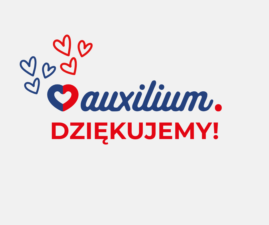 Dostępność: Na plakacie jest prosty i radosny obrazek. Po lewej stronie jest serce w dwóch kolorach – czerwonym i niebieskim – które wygląda jak połączone połówki. Wokół serca unoszą się małe serduszka, niektóre czerwone, niektóre niebieskie. Obok serca, po prawej stronie, jest napis „Auxilium” w niebieskim kolorze, a pod nim duży czerwony napis „DZIĘKUJEMY!”. Cały plakat jest jasny i przyjazny, sprawia wrażenie ciepła i wdzięczności. Kolory są żywe i kontrastowe, co dodaje mu energii i radosnego nastroju.